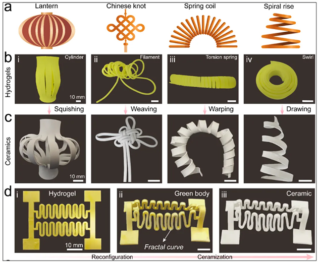 受剪紙藝術(shù)以及智能材料的啟發(fā),研究人員想到,柔性水凝膠就是一種具有一定可變形性的材料,它能在加工或使用過程中展現(xiàn)出多樣化的性能。那么,能不能使陶瓷結(jié)合這種材料特性,像剪紙一樣“裁”成我們需要的形狀呢?