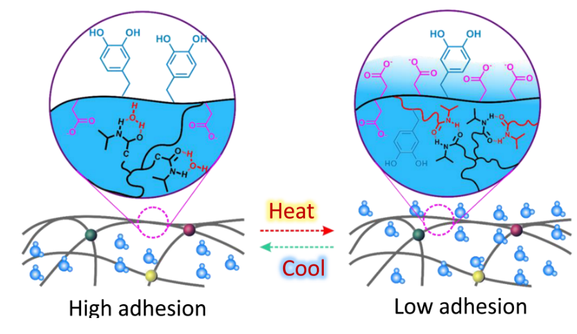 這項(xiàng)突破并非一蹴而就。周峰回憶,幾年前,團(tuán)隊(duì)一直攻關(guān)高強(qiáng)韌黏附水凝膠材料,偶然發(fā)現(xiàn)一種材料在多次按壓后黏性驟降。“該現(xiàn)象引發(fā)了我們的極大興趣,經(jīng)過對材料的成分分析、機(jī)理驗(yàn)證等,才知道原來在多次按壓以后,手部溫度傳遞到凝膠表面,致使凝膠發(fā)生相變,呈現(xiàn)低黏附態(tài)。”這讓團(tuán)隊(duì)意識到,溫度可能是調(diào)控黏附性能的鑰匙。