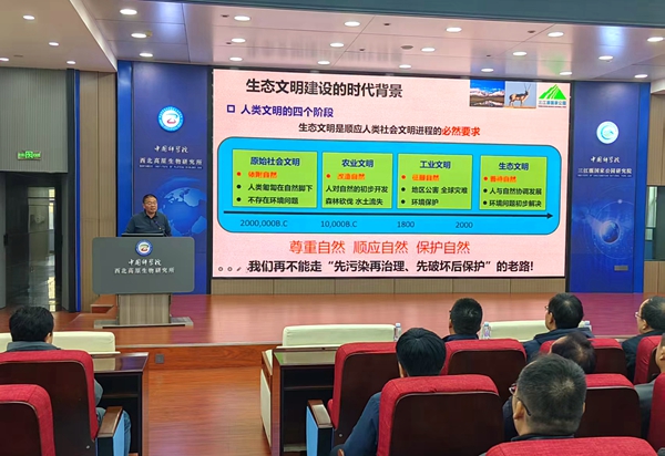 隨后,黨委委員、高原生態(tài)學(xué)研究中心主任徐世曉研究員向參加活動的黨員作了“致力高原生態(tài)學(xué)研究 助力生態(tài)文明發(fā)展”專題報告,報告從生態(tài)文明建設(shè)的時代背景,國家戰(zhàn)略需求、青藏高原生態(tài)安全屏障重要作用等三方面,詳細介紹了西北高原所針對高寒區(qū)生態(tài)系統(tǒng)脆弱性、敏感性,生態(tài)保護和可持續(xù)發(fā)展開展的一系列研究和取得的成果。通過大量案例和數(shù)據(jù),讓大家深入了解了生態(tài)修復(fù)、綠色產(chǎn)業(yè)發(fā)展的成功經(jīng)驗,深刻認識到科學(xué)保護青藏高原生態(tài)系統(tǒng)、推動綠色發(fā)展的重要性。