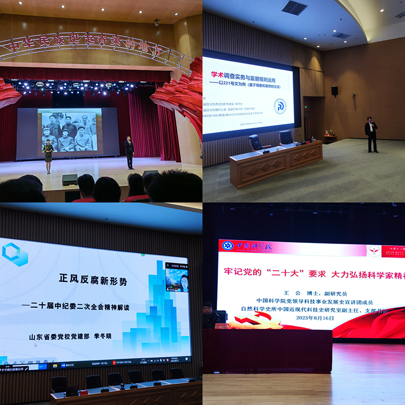 此次培訓結合工作實際,特邀了山東省委黨校季冬曉教授對二十屆中紀委二次全會精神進行解讀,讓參訓人員更加清晰地對全面從嚴治黨體系,特別是黨內(nèi)監(jiān)督的具體內(nèi)容有了更加深入的理解;中國科學院監(jiān)督與審計局科研誠信與倫理辦公室主任侯興宇作題為《學術調(diào)查實務與監(jiān)督規(guī)則運用》輔導報告,提升了在處理科研誠信案件中分析運用的能力;中國近現(xiàn)代科技史研究室副主任、中國科學院黨領導科技事業(yè)發(fā)展史宣講團隊成員、中國科學院自然科學史研究所副研究員王公作《牢記黨的二十大要求 大力弘揚科學家精神》專題講座,以梳理和講述中國科學史的發(fā)展進程為主線,將一代又一代無私奉獻,攻堅克難,以家國命運為己任的科學家事跡貫穿其中,逐步深入地闡述了科學家精神的內(nèi)涵及其時代價值。