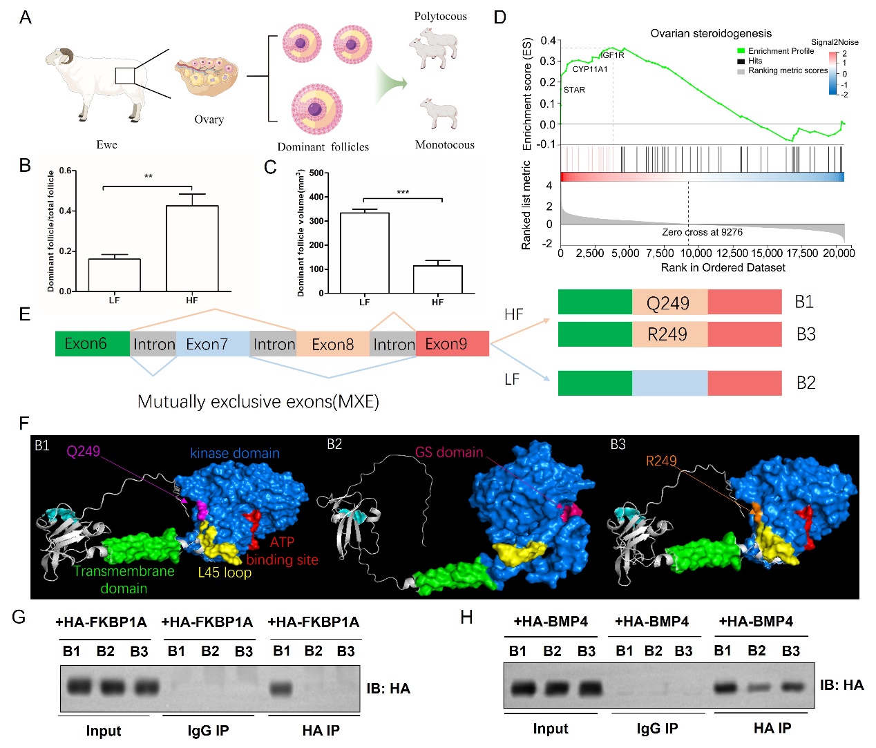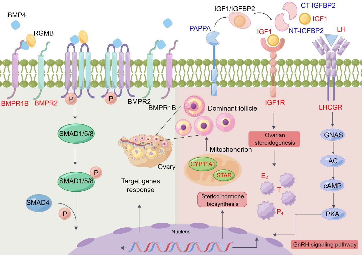中國(guó)科學(xué)院西北高原生物研究所動(dòng)物生態(tài)與資源保護(hù)研究團(tuán)隊(duì)針對(duì)綿羊重要繁殖性狀(產(chǎn)羔數(shù)和產(chǎn)羔間隔),以連續(xù)三個(gè)產(chǎn)羔季節(jié)產(chǎn)多胎(每胎產(chǎn)兩羔或三羔,HF)和產(chǎn)單胎(每胎產(chǎn)一羔,LF)的藏羊?yàn)檠芯繉?duì)象,整合全基因組關(guān)聯(lián)分析、普通轉(zhuǎn)錄組學(xué)、單細(xì)胞轉(zhuǎn)錄組學(xué)、蛋白質(zhì)組學(xué)和代謝組學(xué)等多組學(xué)研究方法,結(jié)合KASP基因分型、實(shí)時(shí)熒光定量PCR、酶聯(lián)免疫吸附實(shí)驗(yàn)、免疫共沉淀和蛋白質(zhì)免疫印跡等分子功能驗(yàn)證實(shí)驗(yàn),挖掘藏羊產(chǎn)羔數(shù)和產(chǎn)羔間隔關(guān)鍵調(diào)控元件并揭示其高繁殖力的遺傳調(diào)控機(jī)制。全基因組關(guān)聯(lián)研究表明,BMPR1B基因與產(chǎn)羔數(shù)性狀相關(guān),PAPPA基因與產(chǎn)羔間隔性狀相關(guān)。首次構(gòu)建了藏羊卵巢單細(xì)胞圖譜,發(fā)現(xiàn)關(guān)鍵基因PAPPA特異性表達(dá)在壁層顆粒細(xì)胞亞群,且BMPR1B基因在壁層顆粒細(xì)胞和固醇生成顆粒亞群高表達(dá)。基于單細(xì)胞轉(zhuǎn)錄組學(xué)、蛋白質(zhì)組學(xué)和代謝組學(xué)整合分析,發(fā)現(xiàn)PAPPA是刺激卵巢優(yōu)勢(shì)卵泡生長(zhǎng)發(fā)育和類固醇生成的關(guān)鍵候選基因。繁殖主效基因BMPR1B除了非同義突變,首次在藏羊中發(fā)現(xiàn)BMPR1B還存在可變剪接事件調(diào)控多胎性狀。該研究結(jié)果對(duì)分子精準(zhǔn)選育提升藏羊繁殖力和實(shí)現(xiàn)藏羊產(chǎn)業(yè)提質(zhì)增效具有重要意義。
