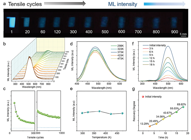 相較于已報道的自恢復(fù)摩擦/力致發(fā)光體系,Ca6BaP4O17:Ce3+/PDMS材料進一步克服了摩擦/力致發(fā)光的重復(fù)性和穩(wěn)定性不足的問題。在10Hz連續(xù)拉伸條件下,該材料可持續(xù)展現(xiàn)出近1000次肉眼可見的藍色發(fā)光。此外,Ca6BaP4O17:Ce3+/PDMS復(fù)合材料在298-473K溫度范圍內(nèi)還展現(xiàn)出了較好的熱穩(wěn)定性能(圖2)。Ca6BaP4O17:Ce3+/PDMS材料的上述摩擦/力致發(fā)光性能主要得益于Ca6BaP4O17:Ce3+獨特的晶體結(jié)構(gòu)和電子結(jié)構(gòu)以及PDMS較強的電子吸附能力,二者在界面摩擦?xí)r的協(xié)同效應(yīng)使得界面摩擦電場誘導(dǎo)電子轟擊發(fā)光過程更加有效。
