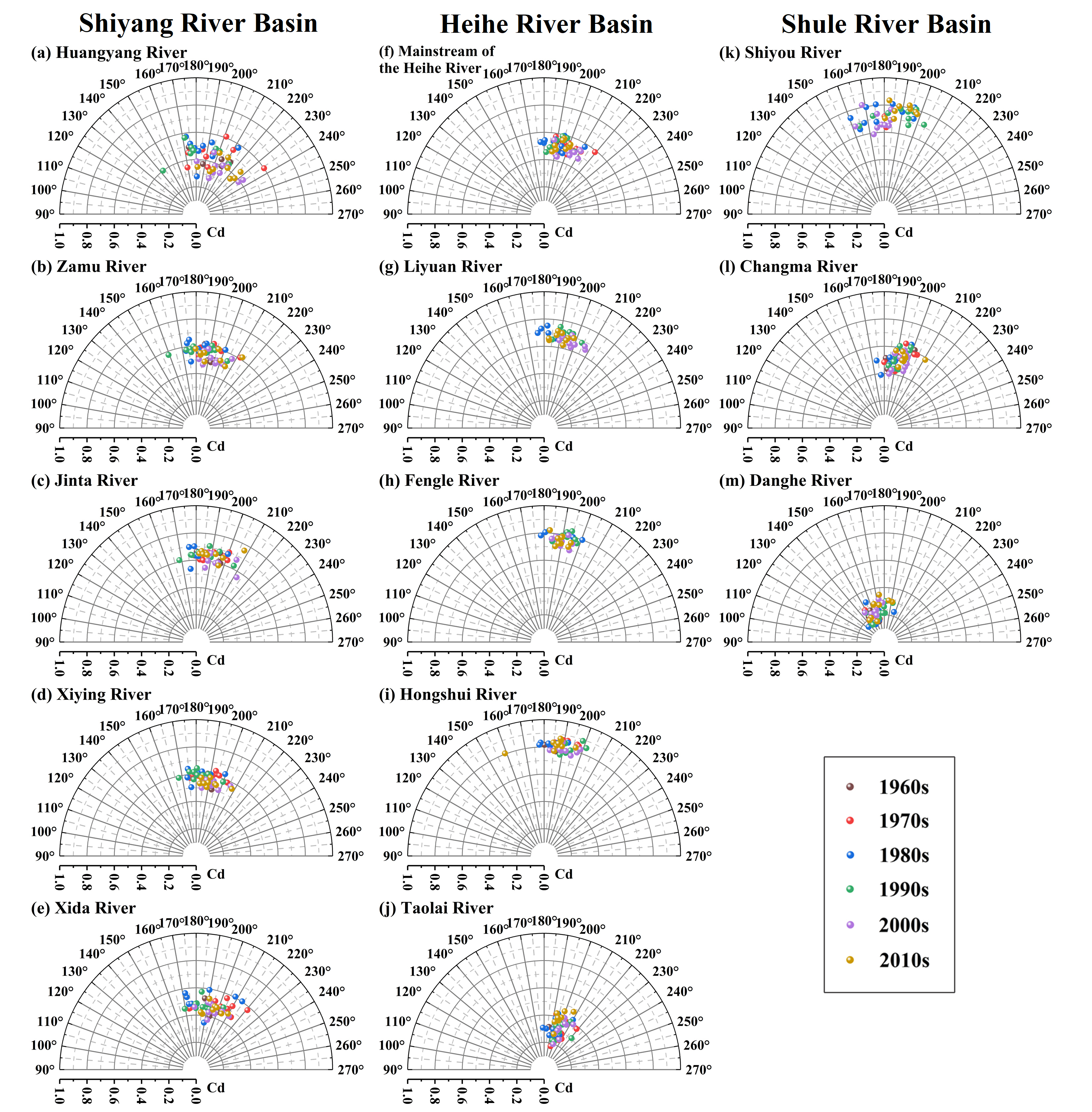 圖2 三大內(nèi)陸河流域徑流分配集中度和集中期的極坐標(biāo)圖