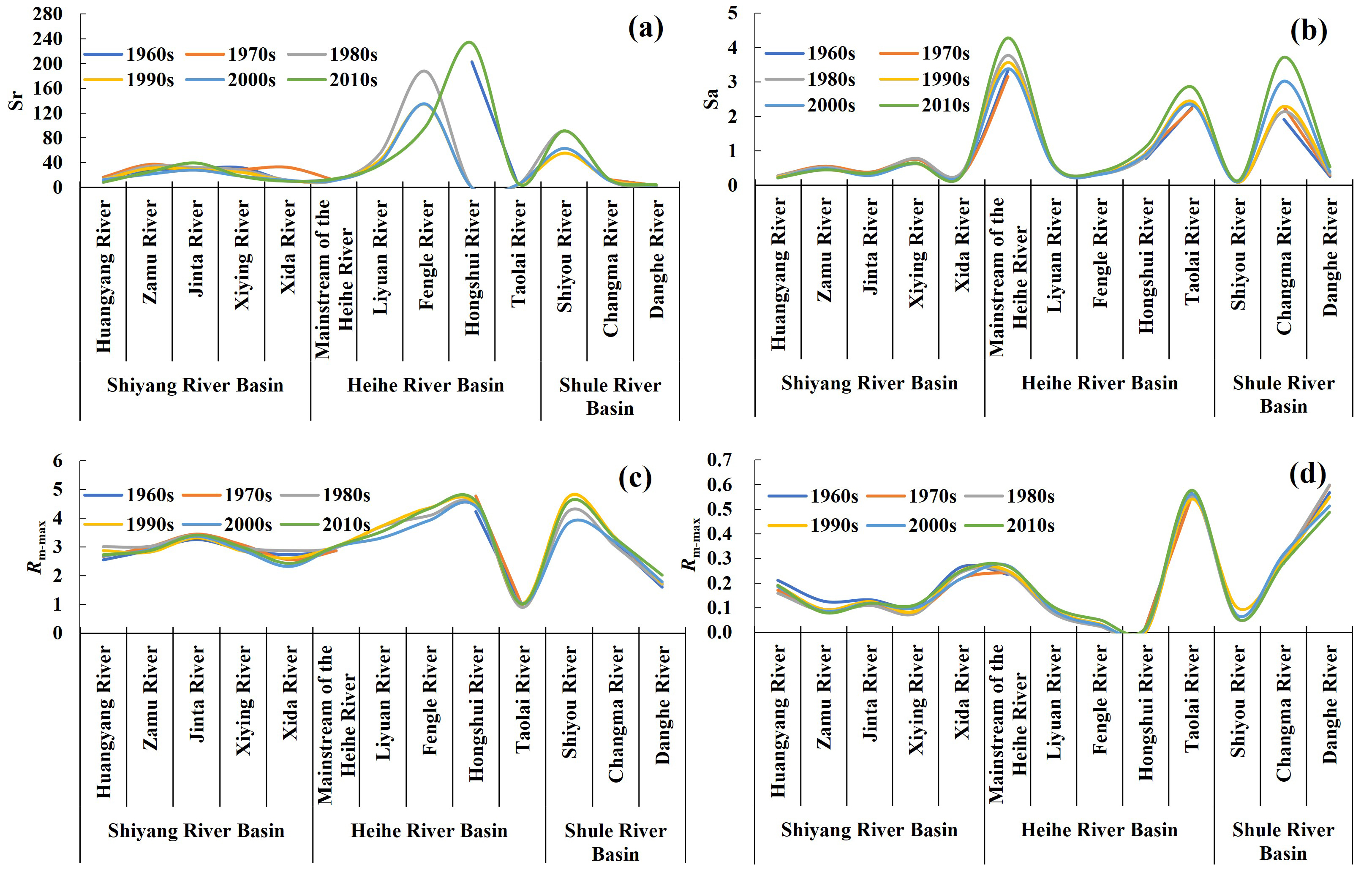 研究發(fā)現(xiàn):1、討賴河及其以西河流(除石油河外)出山徑流年內(nèi)分配不均勻性呈上升趨勢(shì),相反,以東河流呈下降趨勢(shì),但Cv和Cr值仍然很高(圖1);2、石羊河流域年內(nèi)徑流集中期在年際分布上具有相對(duì)離散的特征,1965-2018年期間,石羊河流域徑流年內(nèi)集中期極差值均在40°以上,且黃羊河集中期極差值達(dá)到93°,即集中期出現(xiàn)時(shí)間相差三個(gè)月左右。黑河流域集中期極差值均小于45°,則相對(duì)集中,梨園河、豐樂河、洪水河的徑流年內(nèi)集中度均大于0.6。疏勒河流域的集中度與集中期具有明顯差異,石油河集中期主要分布在160°~200°(約6月末至8月初),集中度分布在0.6~0.9;昌馬河集中期主要分布在180°~200°(7月初至8月初),集中度分布在0.4~0.7;黨河集中期主要分布在130°~200°(5月末至8月初),集中度分布在0.1~0.4。在2000年后,三個(gè)流域的集中期均有所后移(圖2)??傮w上相對(duì)變化幅度由大到小為:洪水河>豐樂河>石油河>梨園河>金塔河>雜木河>西營(yíng)河>西大河>黃羊河>黑河干流>昌馬河>討賴河>黨河(圖3);3、梨園河及以東河流年內(nèi)徑流分配曲線的峰度系數(shù)均小于零,相對(duì)于正態(tài)分布來說,峰面更加平緩,年內(nèi)極端徑流出現(xiàn)的概率更??;以西(除黨河外)峰度系數(shù)均大于零,相對(duì)于正態(tài)分布來說,峰面更加陡峭,徑流更加集中,年內(nèi)極端徑流出現(xiàn)的概率更高(圖4)。相關(guān)研究結(jié)果對(duì)河西走廊水資源的規(guī)劃和管理具有實(shí)際意義,并為預(yù)測(cè)區(qū)域水資源未來變化提供了科學(xué)參考。