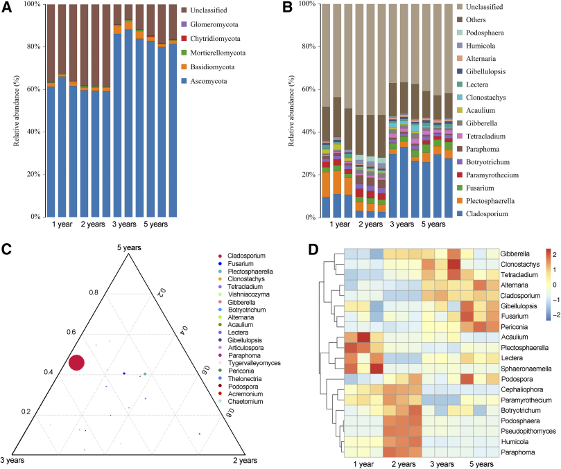 研究表明,黨參大田連作3年后,萎蔫和多種根腐病害頻發(fā);連作3年和5年土壤速效鉀含量和pH值顯著降低;與連作1年和2年相比,連作3年和5年的黨參根際土壤中真菌群落多樣性更高,并且一些屬水平的潛在致病性真菌分類(lèi)群的豐度明顯增加;在連作3年和5年的黨參根際,共分離到Fusarium species complexes等菌33株;且屬水平真菌群落豐度與速效磷、全氮和土壤有機(jī)質(zhì)呈顯著正相關(guān)。