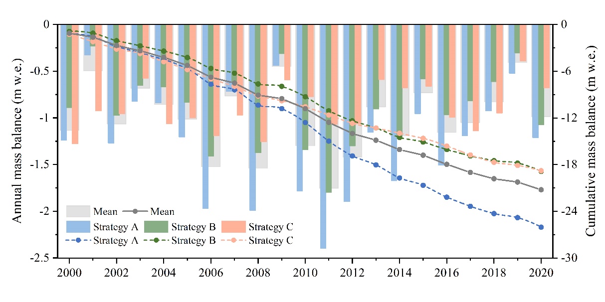 該成果以Historical reconstruction of glacier mass balance and its contribution to water resources in the Sawir Mountains from 2000 to 2020為題發(fā)表于Science of the Total Environment期刊上。碩士研究生余鳳臣為第一作者,王璞玉研究員為通訊作者。該研究獲國家自然科學(xué)基金、中國科學(xué)院青年創(chuàng)新促進(jìn)會(huì)優(yōu)秀會(huì)員項(xiàng)目、新疆第三次綜合科學(xué)考察項(xiàng)目和冰凍圈科學(xué)國家重點(diǎn)實(shí)驗(yàn)室自主項(xiàng)目等聯(lián)合資助。