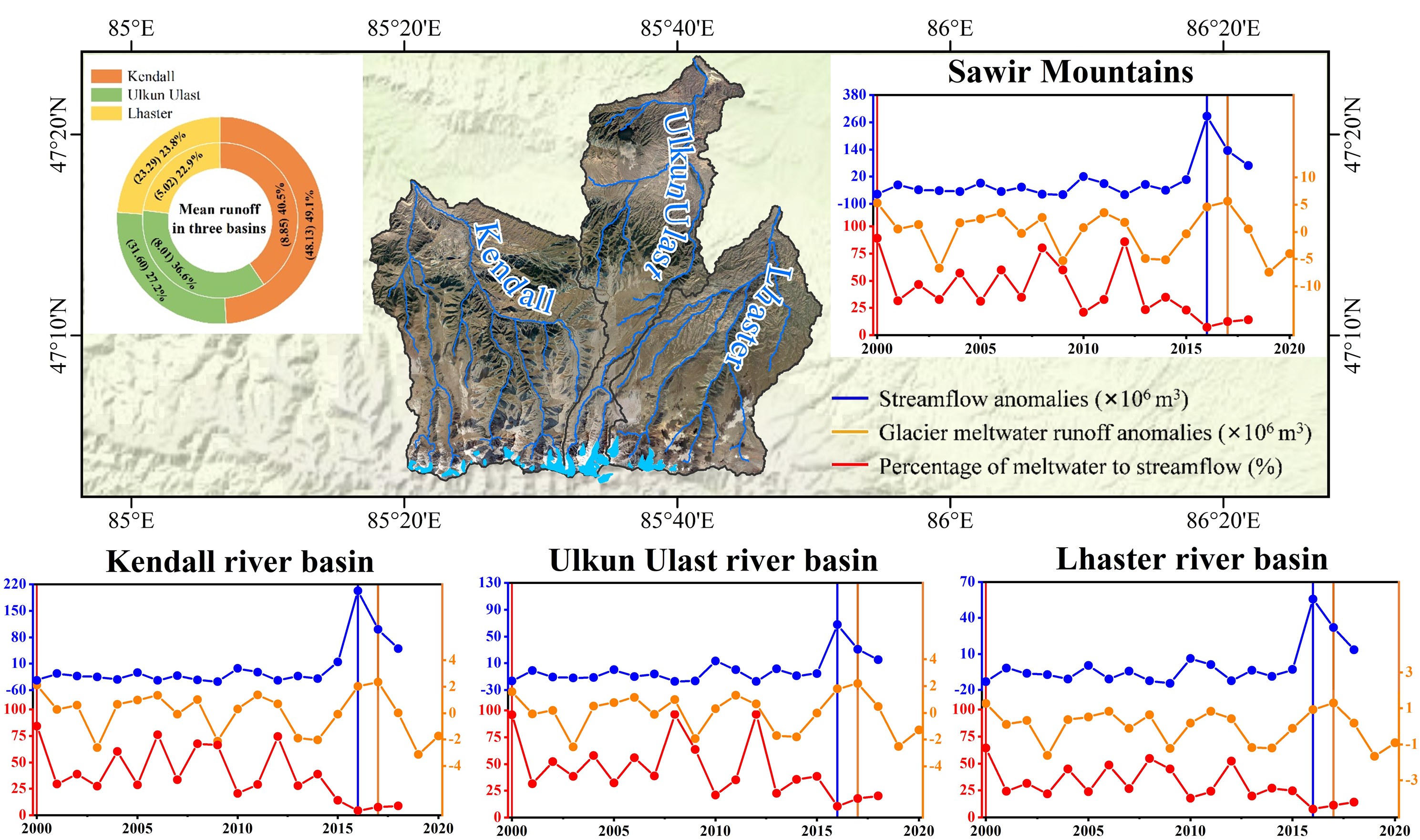 研究結(jié)果表明,2000年至2020年薩吾爾山冰川反照率以0.015?。?0a)-1的速率顯著降低;三種模擬方案均顯示,該區(qū)域冰川經(jīng)歷持續(xù)的物質(zhì)損失,年均物質(zhì)平衡為-1.01 m w.e.(圖2);同時(shí)段內(nèi)該區(qū)域年均冰川融水徑流為22×106 m3,冰川融水徑流占比約為25.81%。所屬三個(gè)子流域(烏勒昆烏拉斯特河、拉斯特河和肯德爾河)冰川融水徑流的貢獻(xiàn)率分別為31.37%、22.51%和19.27%(圖3)。