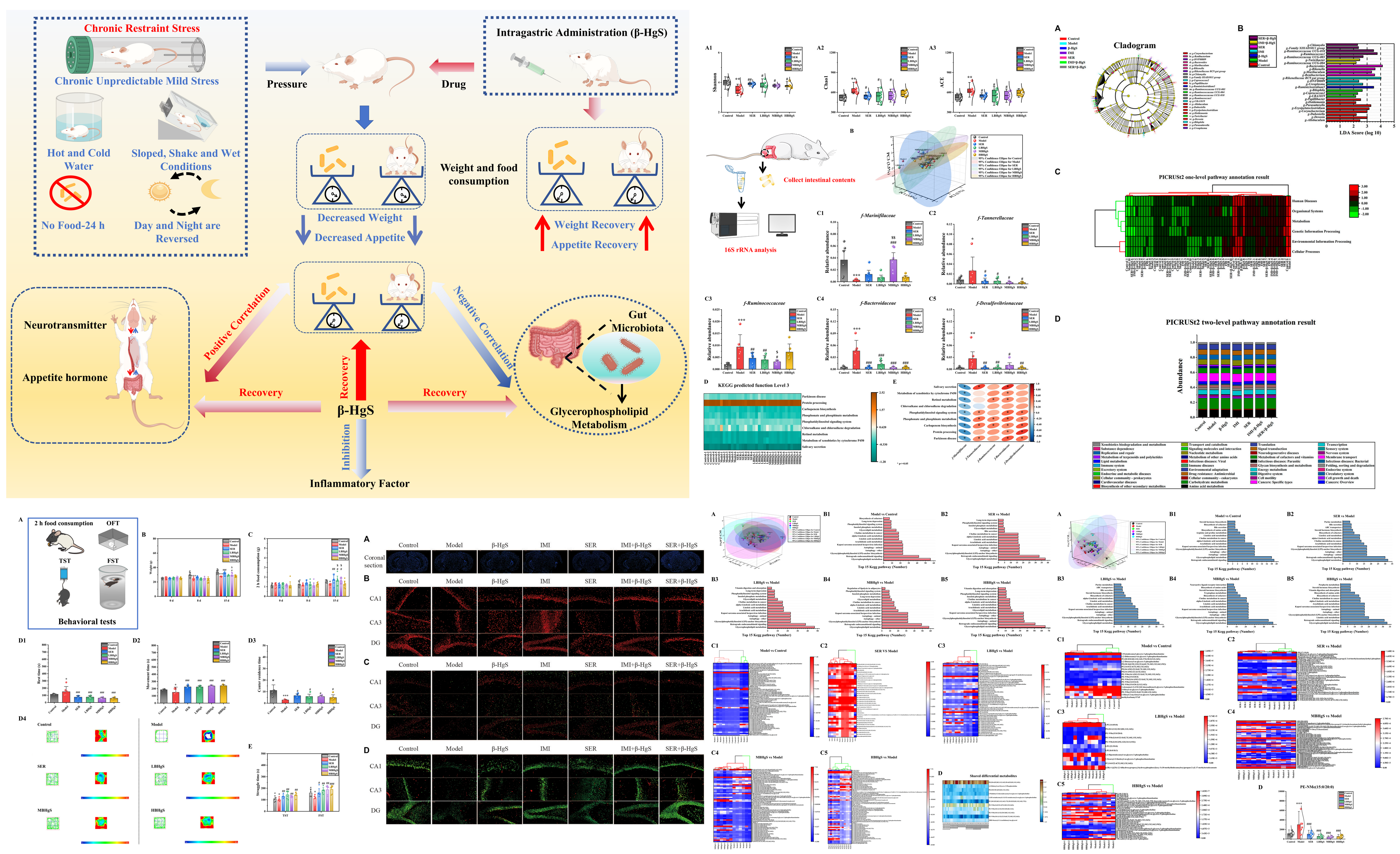 中國科學院西北高原生物研究所高原藏藥資源質(zhì)控與藥理毒理評價研究團隊采用行為學,病理學,多組學等方法,探究β-HgS對抑郁小鼠的調(diào)控途徑。研究結(jié)果表明,β-HgS能夠恢復小鼠抑郁樣行為,改善食欲和體重,增強海馬神經(jīng)元增殖,調(diào)節(jié)腸道內(nèi)環(huán)境,并且β-HgS通過腦-腸軸影響甘油磷脂代謝改善應激小鼠抑郁樣癥狀。此外,β-HgS能夠增強一線抗抑郁藥物(舍曲林)和經(jīng)典抗抑郁藥物(丙咪嗪)的療效。該研究β-HgS為及其母藥佐太在抗抑郁藥品研發(fā)中提供科學依據(jù)。