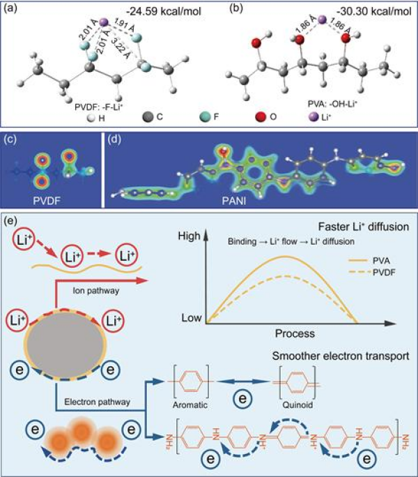 針對(duì)電化學(xué)吸附過(guò)程中電極內(nèi)Li+擴(kuò)散速率和電子轉(zhuǎn)移速率不匹配,從而制約電極電化學(xué)活性的問(wèn)題,設(shè)計(jì)和制備了離子和電子雙導(dǎo)聚(乙烯醇)-聚苯胺(PVA-PANI)共聚物(CP),并包覆到吸附劑顆粒表面,促進(jìn)Li+擴(kuò)散和電子轉(zhuǎn)移,實(shí)現(xiàn)吸附效率的提高。HMO@CP電極具有優(yōu)越的電化學(xué)活性和吸附效率,吸附容量高達(dá)49.48 mg/g。機(jī)理研究表明,PVA中帶負(fù)電荷的羥基(-OH)可以富集Li+并加速Li+的擴(kuò)散,PANI中的共軛結(jié)構(gòu)和氧化還原活性醌類位點(diǎn)提供了更密集的電子分布促進(jìn)電子轉(zhuǎn)移(圖1)。該工作以離子擴(kuò)散和電子轉(zhuǎn)移為出發(fā)點(diǎn),以提高離子擴(kuò)散速率和電子轉(zhuǎn)移速率匹配度為導(dǎo)向,實(shí)現(xiàn)吸附效率的提高(ACS Nano,18?。?024) 31204-31214)。