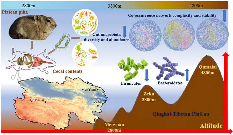 中國(guó)科學(xué)院西北高原生物研究所動(dòng)物生態(tài)與資源保護(hù)研究團(tuán)隊(duì)以青藏高原為研究區(qū)域,系統(tǒng)探討了高原鼠兔(Ochotona curzoniae)在不同海拔梯度下的腸道菌群結(jié)構(gòu)及功能變化。通過(guò)16S rRNA基因測(cè)序及短鏈脂肪酸(SCFA)含量分析,評(píng)估了不同海拔環(huán)境下腸道菌群的組成、功能及代謝特征。研究結(jié)果表明,隨著海拔升高,腸道菌群的α多樣性顯著下降,微生物群共現(xiàn)網(wǎng)絡(luò)的復(fù)雜性亦呈減少趨勢(shì)。然而,SCFA的含量在不同海拔間未表現(xiàn)出顯著差異,表明高原鼠兔對(duì)SCFA的產(chǎn)生和需求可能已趨于穩(wěn)定。此外,微生物群落結(jié)構(gòu)隨海拔變化呈現(xiàn)適應(yīng)性調(diào)整的趨勢(shì),具體表現(xiàn)為擬桿菌門相對(duì)豐度的顯著上升,而厚壁菌門的比例則顯著下降。進(jìn)一步分析微生物群落的組裝機(jī)制發(fā)現(xiàn),隨海拔升高,群落組裝過(guò)程逐漸趨于確定性,表明環(huán)境篩選在高海拔條件下對(duì)微生物群落的塑造作用增強(qiáng)。KEGG通路分析揭示,高原鼠兔腸道菌群在代謝、遺傳信息處理及有機(jī)體系統(tǒng)相關(guān)通路上呈現(xiàn)顯著上調(diào)趨勢(shì)。高原鼠兔腸道菌群可能通過(guò)調(diào)控代謝途徑及富集適應(yīng)高原環(huán)境的微生物種群,以幫助宿主應(yīng)對(duì)極端的高海拔生態(tài)壓力。本研究強(qiáng)調(diào)了腸道菌群在動(dòng)物適應(yīng)極端環(huán)境中的關(guān)鍵作用,揭示了海拔對(duì)腸道菌群組成與功能的影響,為理解動(dòng)物如何通過(guò)微生物機(jī)制適應(yīng)高海拔環(huán)境提供了科學(xué)依據(jù)。研究成果不僅對(duì)高原鼠兔的生態(tài)適應(yīng)研究具有重要意義,也為其他極端環(huán)境物種的研究提供了參考。