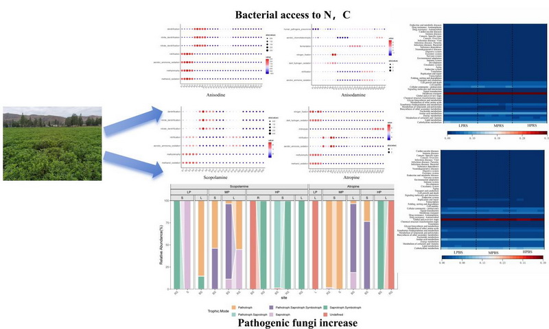 中國科學(xué)院西北高原生物研究所高原藥用資源生態(tài)保護(hù)與繁育研究團(tuán)隊(duì)以山莨菪為研究對(duì)象,基于微生物組和不同磷肥添加水平下生物堿含量的靶向測(cè)定,分析了磷肥添加對(duì)山莨菪生物堿含量的影響,揭示了土壤-微生物-植物相互作用的新機(jī)制。研究表明:磷肥通過雙重途徑對(duì)生物堿含量產(chǎn)生影響。一方面,土壤氮磷比例失調(diào)打破了土壤微生物氮循環(huán)的平衡,促使更多的細(xì)菌通過硝化-反硝化等過程獲得氮源和碳源,體現(xiàn)了磷肥添加下生物堿合成所需的氮源和能量的缺乏,干擾了植物次生代謝的資源分配;另一方面,磷肥添加重構(gòu)了微生物群落的功能布局,表現(xiàn)為低磷環(huán)境下菌根共生系統(tǒng)對(duì)碳、氮、磷的協(xié)同代謝增強(qiáng),而高磷環(huán)境下病原真菌大量繁殖阻礙了生物堿在植物體內(nèi)的合成和積累。這種微生物功能群落的生態(tài)位分化表明土壤養(yǎng)分?jǐn)_動(dòng)會(huì)改變微生物代謝網(wǎng)絡(luò),進(jìn)而調(diào)控藥用植物的次生代謝,為分析人工栽培中土壤管理、微生物功能和藥材質(zhì)量之間的耦合關(guān)系提供了理論依據(jù),明確了養(yǎng)分-微生物-代謝的級(jí)聯(lián)調(diào)控效應(yīng),為山莨菪的高效利用和價(jià)值提升提供了新見解。未來的研究應(yīng)重點(diǎn)關(guān)注基于微生物功能調(diào)控的精準(zhǔn)施肥策略,以實(shí)現(xiàn)藥用植物栽培中產(chǎn)量和品質(zhì)的協(xié)同提升。