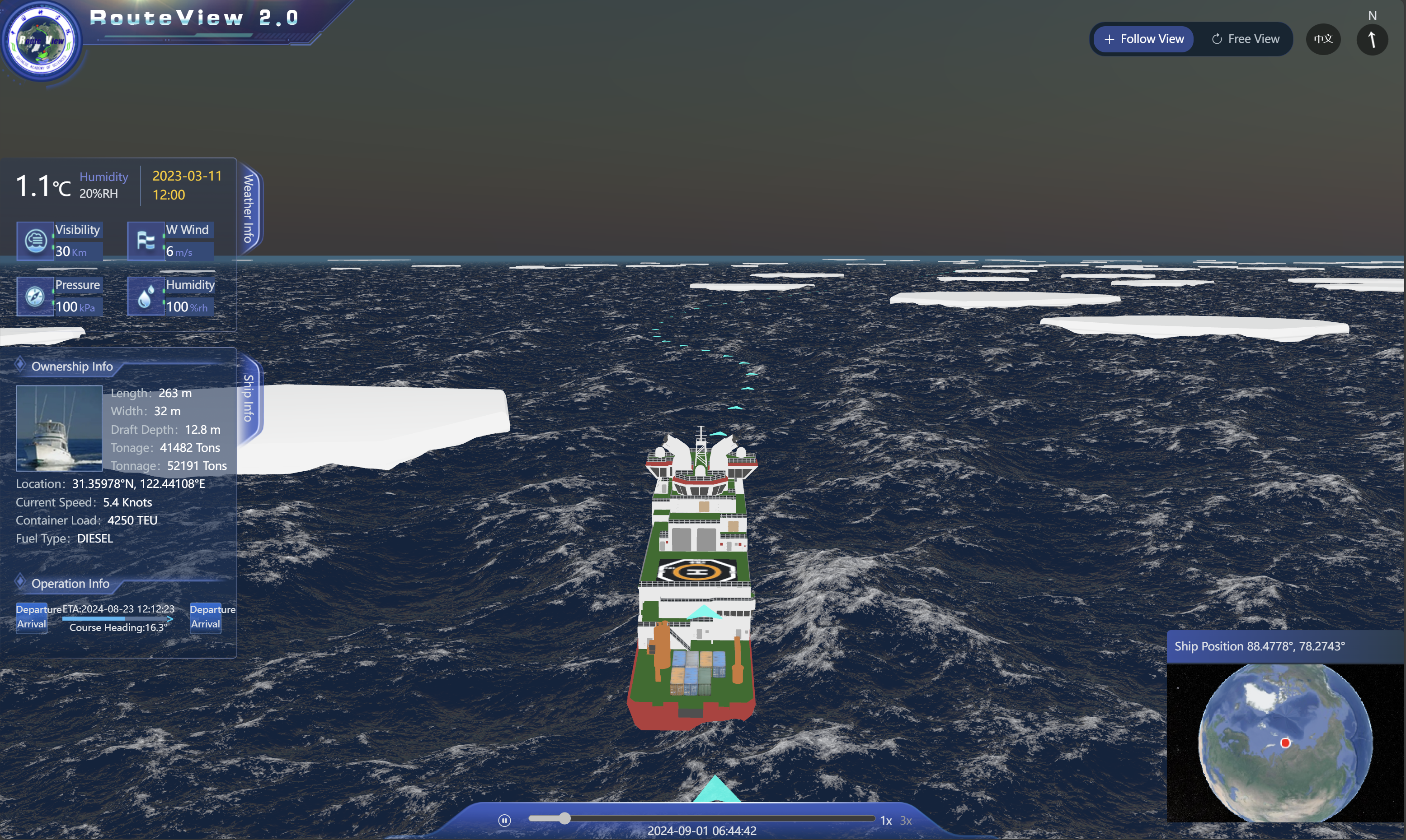 新系統(tǒng)RouteView 2.0從三個(gè)方面提升了極地船舶航行服務(wù)的智能化水平。在船舶航行前方獨(dú)立浮冰實(shí)時(shí)監(jiān)測(cè)方面,該系統(tǒng)突破了傳統(tǒng)千米級(jí)冰情數(shù)據(jù)的粗分辨率限制,構(gòu)建了次公里級(jí)獨(dú)立浮冰在線計(jì)算框架,實(shí)現(xiàn)了東北航道浮冰分布的實(shí)時(shí)動(dòng)態(tài)解析,顯著提升了浮冰信息提取的時(shí)效性與靈活性(250米分辨率)。在船舶航行前方海霧模擬預(yù)警體系方面,該系統(tǒng)基于Polar WRF數(shù)值模型,實(shí)現(xiàn)了對(duì)船舶航行前方海霧的精準(zhǔn)反演(6小時(shí)間隔、5千米分辨率),為低能見(jiàn)度航行提供了實(shí)時(shí)預(yù)警支持。在數(shù)字孿生驅(qū)動(dòng)的智能決策方面,該系統(tǒng)構(gòu)建了北極航道船舶及航行環(huán)境的三維實(shí)景模型,實(shí)時(shí)接入浮冰、海霧等模型計(jì)算數(shù)據(jù),實(shí)現(xiàn)了東北航道局部海域船舶航行的沉浸式展示,形成一種新的航線規(guī)劃可視化手段。