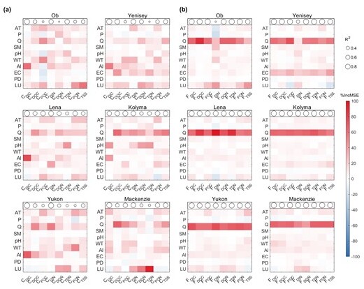 使用隨機(jī)森林(RF)模型按%IncMSE排序,確定泛北極河流中顆粒物(碳、氮和懸浮顆粒物)濃度(a)和通量(b)的影響因子