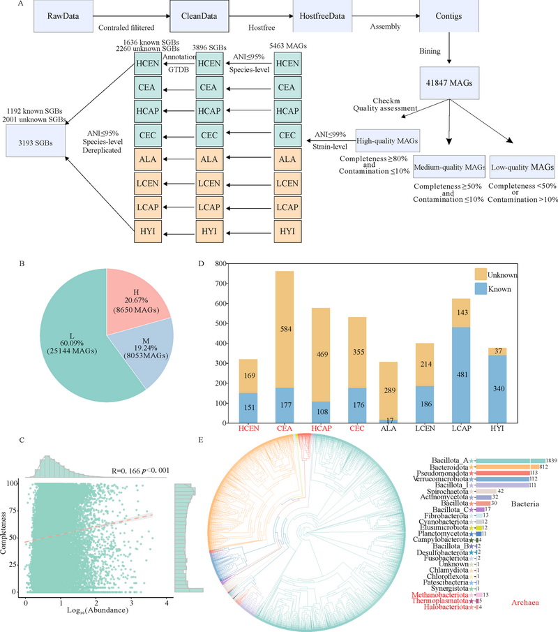 研究采集了青藏高原地區(qū)多種鹿科動(dòng)物的糞便樣本,并結(jié)合公共數(shù)據(jù)庫中平原地區(qū)鹿科動(dòng)物樣本進(jìn)行分析,通過宏基因組組裝共獲得了41,847個(gè)宏基因組組裝基因組(MAGs),并構(gòu)建了3,193個(gè)高質(zhì)量物種水平基因組,建立了目前最為系統(tǒng)、全面的鹿科動(dòng)物腸道微生物組數(shù)據(jù)庫。這是國(guó)內(nèi)外首個(gè)基于多物種、大規(guī)模宏基因組分析的鹿科動(dòng)物腸道微生物資源庫,為后續(xù)功能挖掘、微生物資源利用及瀕危物種保護(hù)提供了堅(jiān)實(shí)的數(shù)據(jù)基礎(chǔ)。