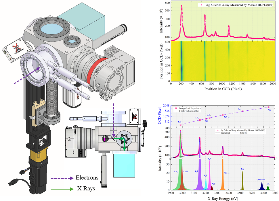 為進(jìn)一步研究這類空心原子的產(chǎn)生與退激特性,科研人員自主研發(fā)了用于多空穴離子X射線精細(xì)結(jié)構(gòu)測(cè)量的緊湊型寬帶高分辨平面晶體譜儀。該譜儀采用了針對(duì)多空穴離子X射線譜特點(diǎn)的獨(dú)特幾何構(gòu)型,通過(guò)靶平動(dòng)伴隨晶體同步轉(zhuǎn)動(dòng),大幅提升了譜儀調(diào)節(jié)精準(zhǔn)度和便捷性。此外,該譜儀在緊湊的空間內(nèi)實(shí)現(xiàn)了0.53-19.3 keV的動(dòng)態(tài)范圍及0.04-6.58 keV的單次曝光帶寬,全動(dòng)態(tài)范圍內(nèi)的能譜分辨力好于102,采用馬賽克晶體時(shí)的探測(cè)效率較傳統(tǒng)平面晶體譜儀提高了20倍以上。