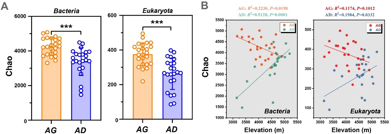 研究發(fā)現(xiàn),兩類(lèi)生態(tài)系統(tǒng)中,細(xì)菌和真核生物α-多樣性呈現(xiàn)相反的海拔格局。高寒草地隨海拔升高顯著線性下降,而高寒荒漠則顯著線性上升。