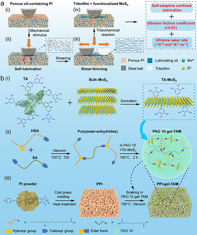近期,中國科學(xué)院蘭州化學(xué)物理研究所潤滑材料全國重點(diǎn)實(shí)驗(yàn)室王道愛研究員團(tuán)隊(duì)基于"自適應(yīng)限域潤滑"的策略(圖1),設(shè)計(jì)制備了MoS2-油凝膠復(fù)合的多孔聚酰亞胺(PPI-gel-TAM),具有高的儲(chǔ)油能力(18.2%)和油保持率(97.7%),實(shí)現(xiàn)了鋼/PPI界面自適應(yīng)的宏觀超潤滑(摩擦系數(shù):~0.007)和超低的磨損率(2.81×10-8·mm3·N-1·m-1),展現(xiàn)出出色的摩擦學(xué)性能,為未來發(fā)展高性能的工程極限潤滑材料提供了新的見解和思路。