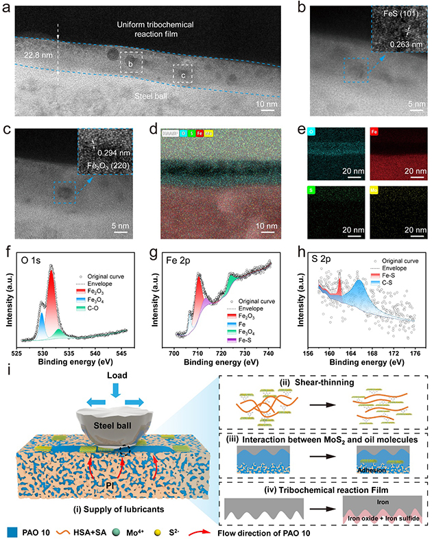 鋼/PPI界面宏觀超潤滑機(jī)理可歸因于四種機(jī)制的耦合作用,多孔結(jié)構(gòu)的儲(chǔ)油/釋放、潤滑劑的剪切變稀特性、功能化的二硫化鉬與油分子之間的相互作用以及摩擦保護(hù)膜的形成(圖2)。
