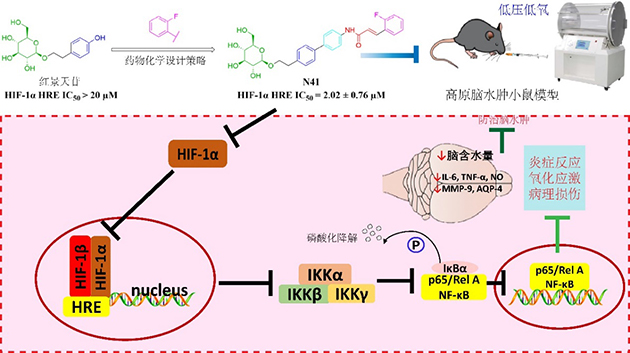 研究團(tuán)隊聚焦高原腦水腫防治重大問題,以高原特色中草藥紅景天中的活性成分紅景天苷為結(jié)構(gòu)基礎(chǔ),基于骨架躍遷和分子雜合的藥物設(shè)計策略,通過引入鄰氟苯基HIF-1α抑制劑藥效團(tuán),對紅景天苷的糖苷鍵、連接鏈、芳環(huán)取代基等三個部分進(jìn)行結(jié)構(gòu)修飾,設(shè)計并合成了多種紅景天苷衍生物開展構(gòu)效關(guān)系研究。通過雙熒光素酶報告基因、細(xì)胞毒、ELISA等實(shí)驗(yàn),篩選獲得強(qiáng)活性化合物N41,可顯著抑制HIF-1α HRE轉(zhuǎn)錄(IC50: 2.02 ± 0.76 μM),減少C8-D1A細(xì)胞炎癥因子IL-6和NO的表達(dá)以及ROS積累,減輕氧化損傷且無明顯細(xì)胞毒性。HACE小鼠模型研究發(fā)現(xiàn),N41可有效降低HACE模型小鼠腦含水量,改善缺氧導(dǎo)致的腦組織損傷,通過阻斷HIF-1α/IKKα/NF-κB信號通路,抑制下游TNF-α、IL-6等炎癥因子及MMP-9、AQP-4等血腦屏障通透性相關(guān)因子表達(dá),緩解炎癥反應(yīng)和維持血腦屏障完整性,發(fā)揮高原腦水腫防治功效。相關(guān)研究成果發(fā)表在European Journal of Medicinal Chemistry(2025,297: 117982)上。