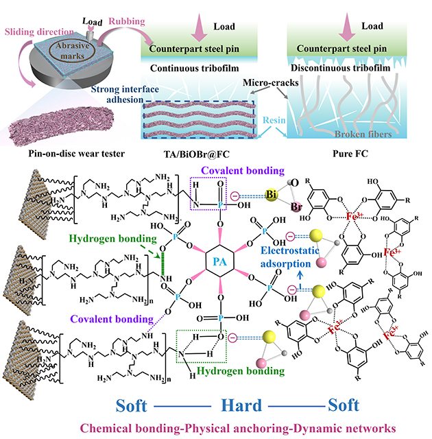 團隊人員在此基礎(chǔ)上提出了在纖維織物表面構(gòu)建“軟-硬-軟”結(jié)構(gòu)增強復(fù)合材料的摩擦學性能的磨損機理。未經(jīng)改性的復(fù)合材料在受到外部擠壓和剪切力的作用下,出現(xiàn)大量的微裂紋并伴隨纖維嚴重拔出斷裂,隨后在對偶表面形成不均勻不連續(xù)的摩擦膜。而TA/BiOBr@FC經(jīng)由表界面改性,織物界面從微觀到宏觀形成了化學鍵合-物理錨定-動態(tài)網(wǎng)絡(luò)的多級增強體系,避免纖維-樹脂界面脫黏和纖維拔出,顯著提升了CF/PTFE纖維織物復(fù)合材料的界面性能和摩擦學性能。
