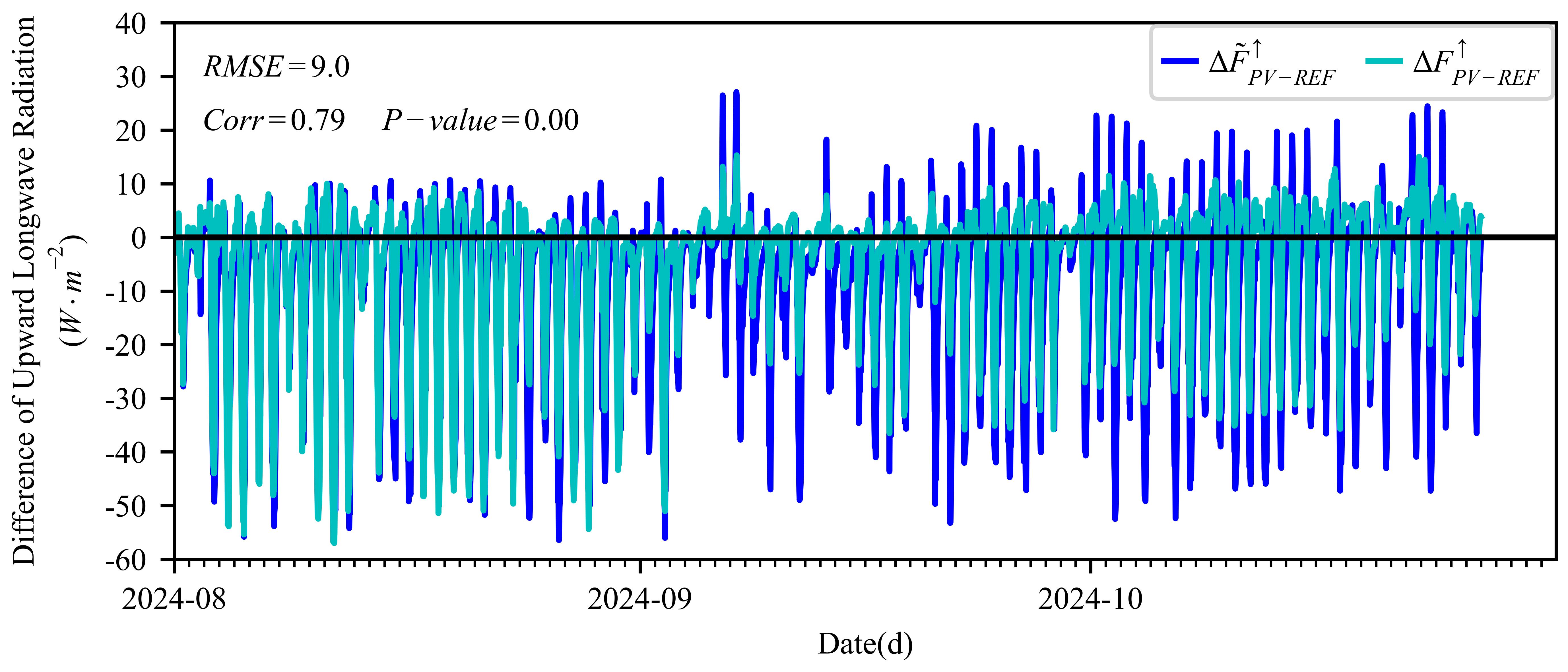 光伏電站內(nèi)外向上長波輻射通量密度之差的逐日變化:實(shí)測值(?F_(PV-REF)^↑)和PV3R模型輸出值(?F ?_(PV-REF)^↑)