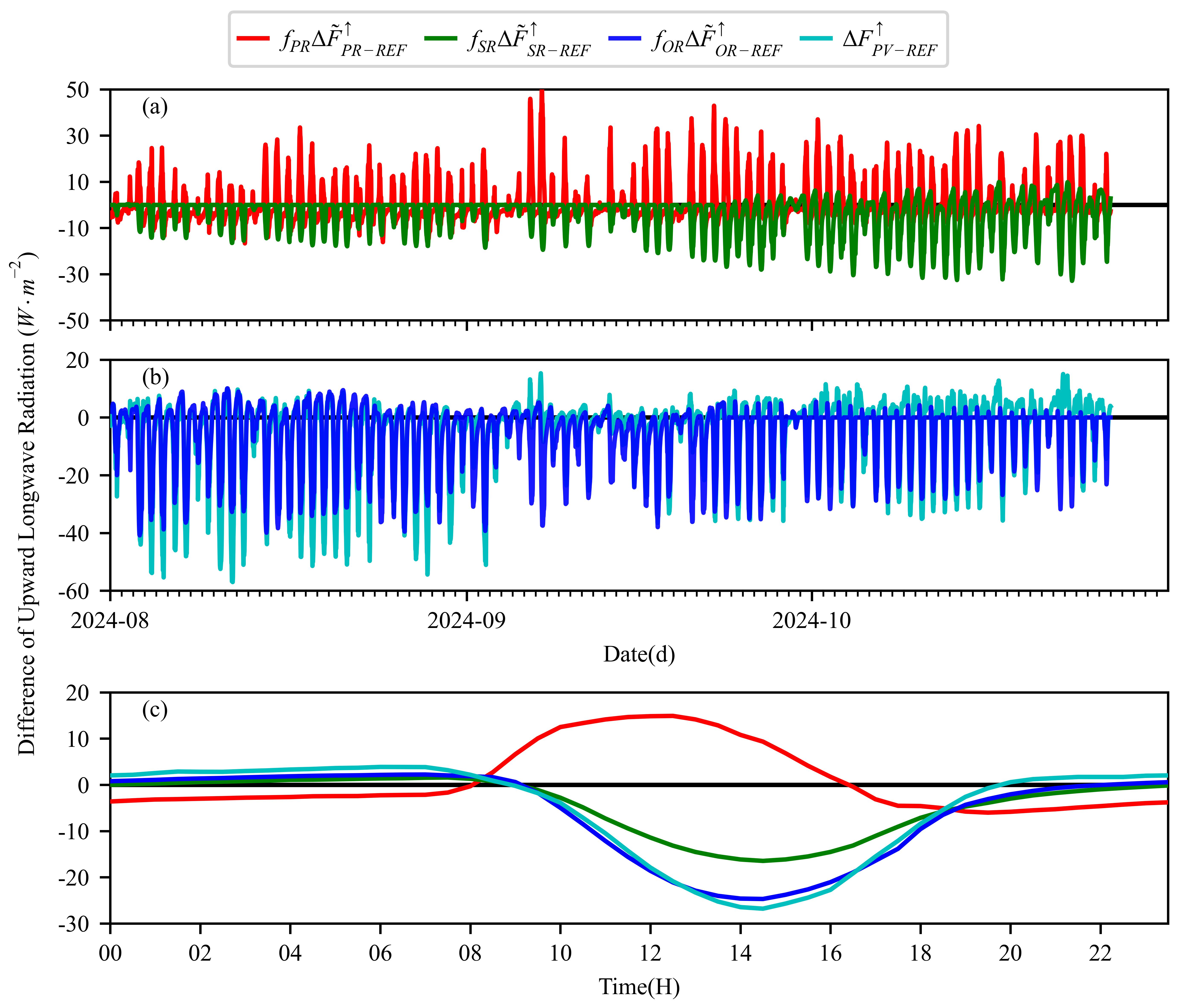 PV3R模型輸出的光伏電站內(nèi)外向上長波輻射通量密度之差各分量的逐日變化和平均日變化。(a):PV3R模型輸出的光伏陣列區(qū)和參考點(diǎn)向上長波輻射通量密度之差(f_PR ?F ?_(PR-REF)^↑)以及PV3R模型輸出的遮蔽區(qū)和參考點(diǎn)向上長波輻射通量密度之差(f_SR ?F ?_(SR-REF)^↑)的逐日變化;(b):PV3R模型輸出的非遮蔽區(qū)和參考點(diǎn)向上長波輻射通量密度之差(f_OR ?F ?_(OR-REF)^↑)以及觀測到的光伏電站內(nèi)外向上長波輻射通量密度之差(?F_(PV-REF)^↑)的逐日變化;(c):f_PR ?F ?_(PR-REF)^↑、f_SR ?F ?_(SR-REF)^↑、f_OR ?F ?_(OR-REF)^↑和?F_(PV-REF)^↑的平均日變化。