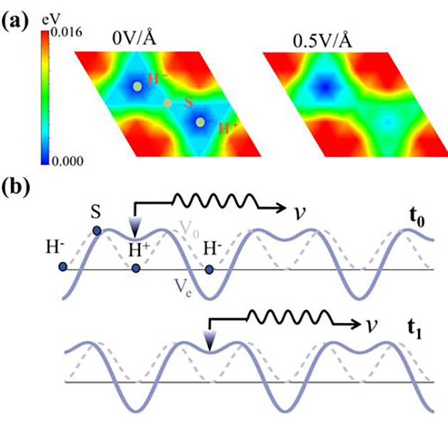 圖2. (a)不同電場下,雙層h-BN的摩擦勢能面;(b)系統(tǒng)沿最佳滑移路徑(H+→S→H-→S→H+)的勢能曲線,虛線和實線分別表示無外場和施加交變電場的結(jié)果。