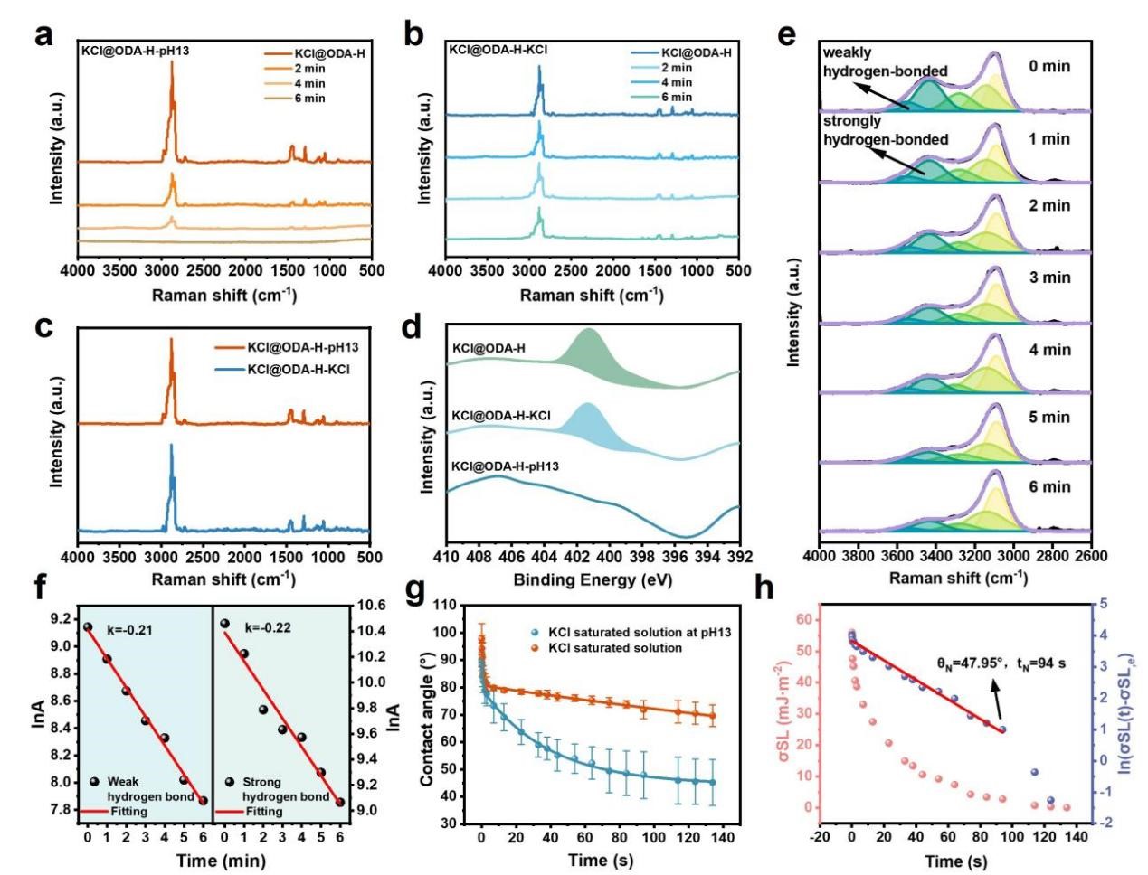 另一項工作則通過以堿度調(diào)控方式提高ODA-H的原位脫附效率,其KCl表面ODA-H的脫附率達到87%。MD模擬計算表明,OH?導致親水基團(-NH3+)去質子化,破壞了ODA-H與KCl表面之間的靜電相互作用,并在堿性條件下促使親水基團脫離KCl表面。該機制可通過以下三個遞進階段系統(tǒng)闡明:(1)OH?誘導ODA-H脫附;(2)固–液界面張力降低;(3)擴散過程加速,從而促進OH?向吸附位點的高效傳輸。
