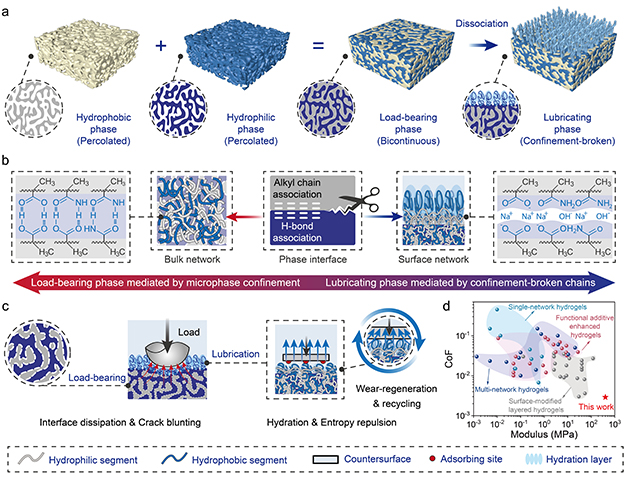 在人體關節(jié)中,軟骨依托多尺度膠原網絡、多相組分及其界面的協(xié)同作用,構建出兼具高承載與超低摩擦的天然潤滑系統(tǒng)?;谶@一特性,水凝膠作為有潛力的人工軟骨替代材料備受關注。然而,傳統(tǒng)潤滑水凝膠往往因結構均一性而陷入兩難境地,提高整體網絡致密度雖能增強力學性能,卻會削弱表面水合與潤滑能力;單純追求低摩擦,又會使材料在高載荷下迅速變形、蠕變甚至失效。這種長期存在的性能權衡,嚴重制約了水凝膠在高載荷、長壽命潤滑場景中的實際應用。