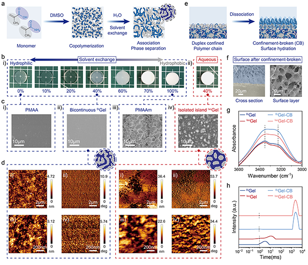圖2. (a) 通過溶劑交換策略制備結構可調線性共聚物水凝膠網絡的示意圖。(b) 不同MAAm含量(摩爾分數)水凝膠的宏觀光學照片。(c) 不同水凝膠的掃描電鏡圖像。(d)BiGel和IsoGel的原子力顯微鏡高度圖與相圖。(e) 表面限域破壞處理形成潤滑層的示意圖。(f)?BiGel-CB截面掃描電鏡圖像,顯示梯度結構。(g)?BiGel、IsoGel及其限域破壞后樣品表面的ATR-FTIR光譜。(h) 不同水凝膠的LF-NMR T?弛豫時間分布。