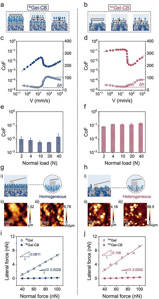 圖4.(a)?BiGel-CB和(b)?IsoGel-CB的潤滑機制示意圖。(c, d)?BiGel-CB和IsoGel-CB的Stribeck曲線及相應水合高度變化。(e, f) 在邊界潤滑狀態(tài)下,摩擦系數隨載荷的變化。(g, h)?BiGel-CB和IsoGel-CB表面的AFM高度圖。(k, l) 利用LFM測得的側向力-法向力曲線及計算得出的微觀摩擦系數。