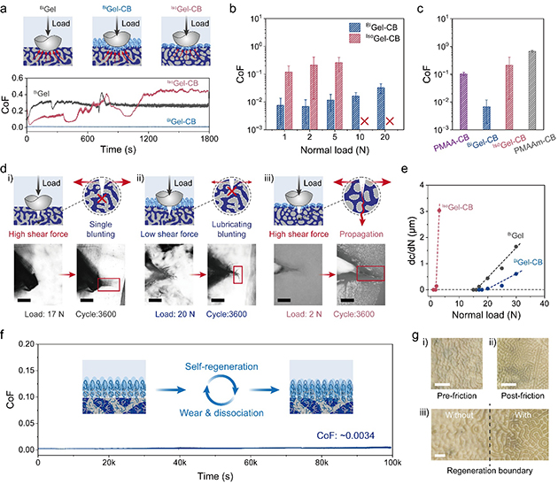 圖5.(a) 摩擦測試示意圖及BiGel、BiGel-CB和IsoGel-CB對應的摩擦系數曲線。(b)?BiGel-CB和IsoGel-CB摩擦系數隨載荷的變化。(c) PMAA-CB、BiGel-CB、PMAAm-CB和IsoGel-CB樣品的平均摩擦系數。(d) 摩擦裂紋擴展示意圖及 i)?BiGel, ii)?BiGel-CB, iii)?IsoGel-CB的裂紋光學圖像(比例尺:200 μm)。(e)?BiGel、BiGel-CB和IsoGel-CB的界面裂紋擴展速率隨載荷的變化。(f)?BiGel-CB在50 N法向載荷下的長期潤滑性能。(g)?BiGel-CB在PBS溶液中摩擦測試前后的表面光學圖像:i) 摩擦前,ii) 摩擦后,iii) 摩擦邊界(比例尺:200 μm)。