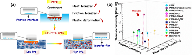 研究人員研究了金屬骨架材料、孔隙率和面密度對連續(xù)相復(fù)合材料性能的影響規(guī)律,結(jié)果表明,泡沫鎳與聚四氟乙烯具有最優(yōu)的親和性,表現(xiàn)為良好的界面結(jié)合與高填充率。隨孔隙率降低、面密度增加,泡沫金屬-聚四氟乙烯互穿相復(fù)合材料力學(xué)強(qiáng)度、摩擦磨損性能、導(dǎo)熱性能均隨之升高。特別是,以2%體積分?jǐn)?shù)、孔隙率80%泡沫鎳增強(qiáng)聚四氟乙烯復(fù)合材料時,拉伸強(qiáng)度超過50 MPa,導(dǎo)熱系數(shù)達(dá)15.26 W/(m·K),磨損率下降98.7%,解決了傳統(tǒng)聚四氟乙烯復(fù)合材料增強(qiáng)效果受制于基體的瓶頸問題。相關(guān)研究結(jié)果發(fā)表在 Friction(2025, 13(5): 9440948)和Tribology International(2025: 111346)上。
