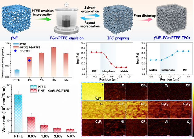 針對泡沫金屬與聚四氟乙烯異質(zhì)界面結(jié)合弱的問題,研究人員采用氟硅烷偶聯(lián)劑對泡沫鎳三維連續(xù)界面進(jìn)行液相氟化改性,同時在基體中引入少量氟化石墨。結(jié)果表明,界面-基體“雙氟化”的設(shè)計(jì)有效增強(qiáng)了泡沫鎳與聚四氟乙烯之間的界面結(jié)合,從而抑制外力拉伸時的變形與裂紋擴(kuò)展;少量氟化石墨的引入增強(qiáng)了PTFE連續(xù)相的硬度、模量,使得雙連續(xù)相復(fù)合材料的導(dǎo)熱系數(shù)提升至1.3 W/(m·K)。得益于由聚四氟乙烯、鎳磨屑與氟化石墨在金屬配副表面形成的復(fù)合摩擦轉(zhuǎn)移膜,進(jìn)一步改善了復(fù)合物的摩擦學(xué)性能,磨損率下降90.7%。相關(guān)研究結(jié)果發(fā)表在Composites Part B: Engineering(2025: 112816)上。