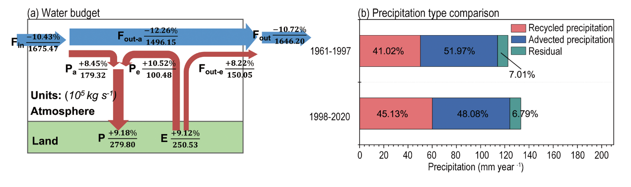 (a)西北干旱區(qū)水分收支圖(圖中數(shù)據(jù)分母為1998–2020年夏季各變量的多年平均值,單位為10? kg/s;分子表示1998–2020年平均值相較于1961–1997年平均值的增加量。其中,F(xiàn)in為水汽流入量,F(xiàn)out為水汽流出量,F(xiàn)out-a和Fout-e分別表示由水平水汽輸送與局地蒸散發(fā)產(chǎn)生的流出水汽;Pa為外部平流水汽形成的降水,Pe為再循環(huán)降水,P為總降水;E為蒸散發(fā));(b)西北干旱區(qū)夏季不同降水類型對比(1961–1997年與1998–2020年平均值;上行:1961–1997年,下行:1998–2020年;紅色:再循環(huán)降水,藍(lán)色:外循環(huán)降水,綠色:殘余項(xiàng);數(shù)值表示各類型水汽占同期總降水的百分比)。