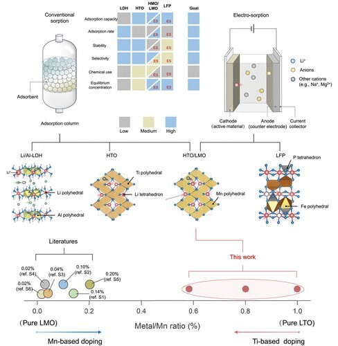 傳統(tǒng)鹽湖提鋰技術(shù)依賴太陽能蒸發(fā)濃縮,具有成本低廉優(yōu)勢,但先提鉀后提鋰工藝流程長,各階段鋰夾帶損失大,導致提高鋰收率成為鹽湖資源開發(fā)的急切需求。近年來,電控吸附技術(shù)在直接提鋰(Direct Lithium Extraction, DLE)上因其高效、綠色環(huán)保的優(yōu)勢,成為鹽湖資源提取的重要發(fā)展方向。然而,在多離子競爭環(huán)境下實現(xiàn)鋰離子的高選擇性、離子高速傳輸及材料長期穩(wěn)定性,仍是該領(lǐng)域面臨的核心科學問題。針對上述挑戰(zhàn),中國科學院青海鹽湖研究所劉忠研究員帶領(lǐng)的離子吸附科學與技術(shù)團隊,長期致力于鹽鹵離子分離材料、工藝、和裝備的系統(tǒng)研發(fā)。團隊在多類吸附材料研究中,鈦吸附劑因離子選擇性高,鈦氧鍵結(jié)構(gòu)穩(wěn)定性好,其工業(yè)化前景十分廣闊。但在實際電控吸附過程中,如何提高離子和電子傳輸,同步實現(xiàn)高吸附容量和高電化學反應速率,仍然是使用過程中面臨的難題。