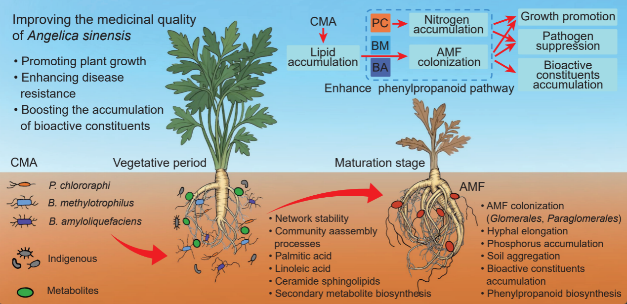 兩項(xiàng)研究分別從激素與苯丙烷代謝調(diào)控以及“功能互補(bǔ)菌群—AMF協(xié)同作用”兩個(gè)層面,揭示了微生物介入對(duì)當(dāng)歸生長(zhǎng)和藥用成分積累的調(diào)控機(jī)制,為“生防菌調(diào)控—宿主響應(yīng)—品質(zhì)形成”提供了重要的實(shí)驗(yàn)依據(jù),并為相關(guān)機(jī)制研究奠定了堅(jiān)實(shí)基礎(chǔ)。