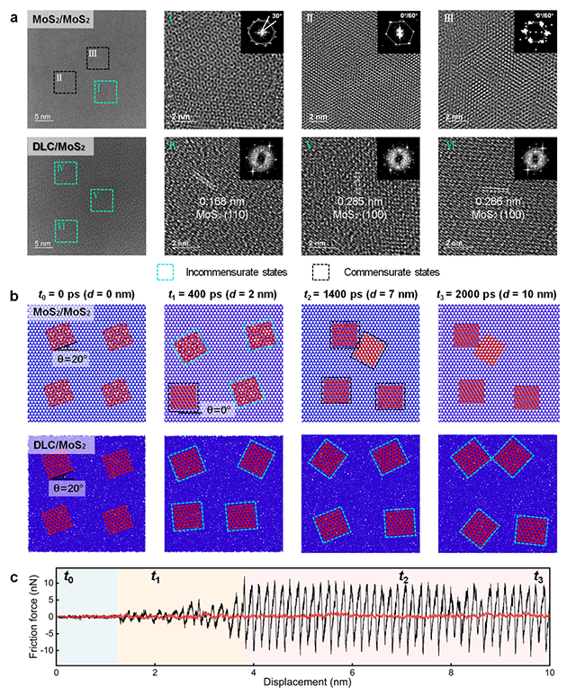 超潤(rùn)滑工程尺度實(shí)現(xiàn)面臨三大核心挑戰(zhàn),即大尺度接觸面的隨機(jī)無(wú)序性導(dǎo)致超潤(rùn)滑失控、高接觸壓力下界面形變導(dǎo)致超潤(rùn)滑失效、大氣環(huán)境活性氣氛引發(fā)界面摩擦化學(xué)反應(yīng)導(dǎo)致超潤(rùn)滑失穩(wěn)。針對(duì)上述挑戰(zhàn),研究團(tuán)隊(duì)從“宏觀接觸-微納界面-分子構(gòu)型-原子晶格”跨尺度結(jié)構(gòu)進(jìn)行逐級(jí)設(shè)計(jì)。首先,基于歸一化接觸思想,通過(guò)激光織構(gòu)構(gòu)建規(guī)則的接觸陣列,將宏觀面接觸歸一化為無(wú)數(shù)等同的微米級(jí)單元接觸,使每個(gè)單元的接觸狀態(tài)(面積、形狀、 受力等)保持一致,這樣界面潤(rùn)滑材料在同一接觸狀態(tài)下結(jié)構(gòu)變化也趨于一致,整體變得可控(圖1);其次,在每個(gè)接觸單元表面構(gòu)筑剛性非晶類(lèi)金剛石碳(DLC)膜層/柔性晶體MoS2配副滑移元界面,剛?cè)峤Y(jié)合有力削弱接觸界面在極端高接觸壓力下的形變;進(jìn)一步采用MXene作為增強(qiáng)與錨定劑,使晶體MoS2在極端高接觸壓力和大氣環(huán)境下保持完整的層狀結(jié)構(gòu),減少了缺陷與邊緣的不利影響,賦予其抵抗水分子和氧氣氧化能力,從而維持超潤(rùn)滑界面的穩(wěn)定。最后,揭示了運(yùn)動(dòng)過(guò)程中原子晶格匹配的動(dòng)態(tài)偏轉(zhuǎn)微觀機(jī)制(圖2),即非公度態(tài)向公度態(tài)轉(zhuǎn)化,發(fā)現(xiàn)了非晶DLC/晶體MoS2永久非公度接觸特性,從根本上消除了晶格匹配所導(dǎo)致的原子互鎖。