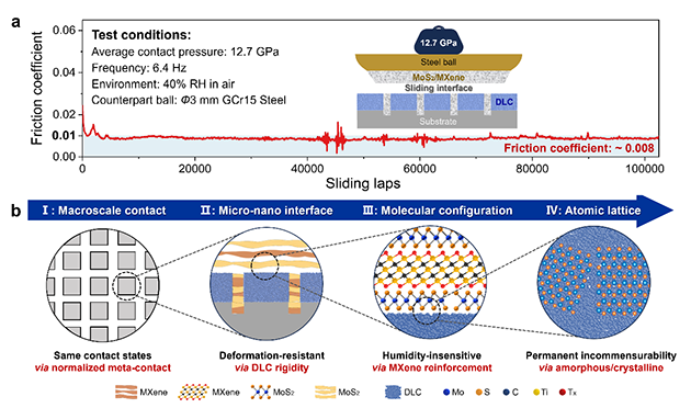 近日,中國(guó)科學(xué)院蘭州化學(xué)物理研究所蘭州潤(rùn)滑材料與技術(shù)創(chuàng)新中心磨損與表面工程課題組提出了一種基于歸一化接觸理念的工程超潤(rùn)滑設(shè)計(jì)原理,建立了從“宏觀接觸-微納界面-分子構(gòu)型-原子晶格”跨尺度結(jié)構(gòu)協(xié)同調(diào)控方法,并與武漢大學(xué)歐陽(yáng)穩(wěn)根教授團(tuán)隊(duì)合作,結(jié)合理論模擬和實(shí)驗(yàn)揭示了摩擦界面晶格匹配的動(dòng)態(tài)微觀演變與超滑機(jī)理,在工程級(jí)接觸尺寸(毫米級(jí))、極端高接觸應(yīng)力(12.7 GPa)及實(shí)際大氣環(huán)境(40% RH)下獲得了穩(wěn)健的超潤(rùn)滑性能,對(duì)推動(dòng)超潤(rùn)滑走向工程化具有重要意義。