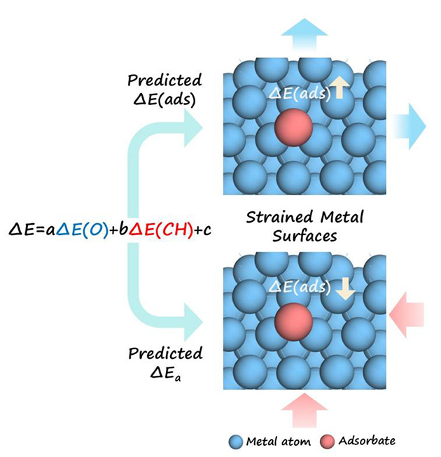 在多相催化反應(yīng)中,活性金屬表面的電子結(jié)構(gòu)對(duì)反應(yīng)物分子的吸附與活化轉(zhuǎn)化起著關(guān)鍵作用。近年來的研究表明,通過對(duì)金屬晶格施加拉伸或壓縮應(yīng)變,可有效調(diào)控其表面電子結(jié)構(gòu),顯著改變反應(yīng)物及關(guān)鍵中間體的吸附行為,進(jìn)而實(shí)現(xiàn)對(duì)催化活性與選擇性的精準(zhǔn)調(diào)控。目前,應(yīng)變工程已成為設(shè)計(jì)高性能催化劑的重要策略。然而,不同金屬體系和不同吸附物對(duì)應(yīng)變呈現(xiàn)出復(fù)雜且差異化的響應(yīng)規(guī)律,至今仍缺乏可定量描述應(yīng)變誘導(dǎo)能量變化的普適性標(biāo)度關(guān)系,制約了高效催化劑的理性設(shè)計(jì)與精準(zhǔn)構(gòu)筑。
