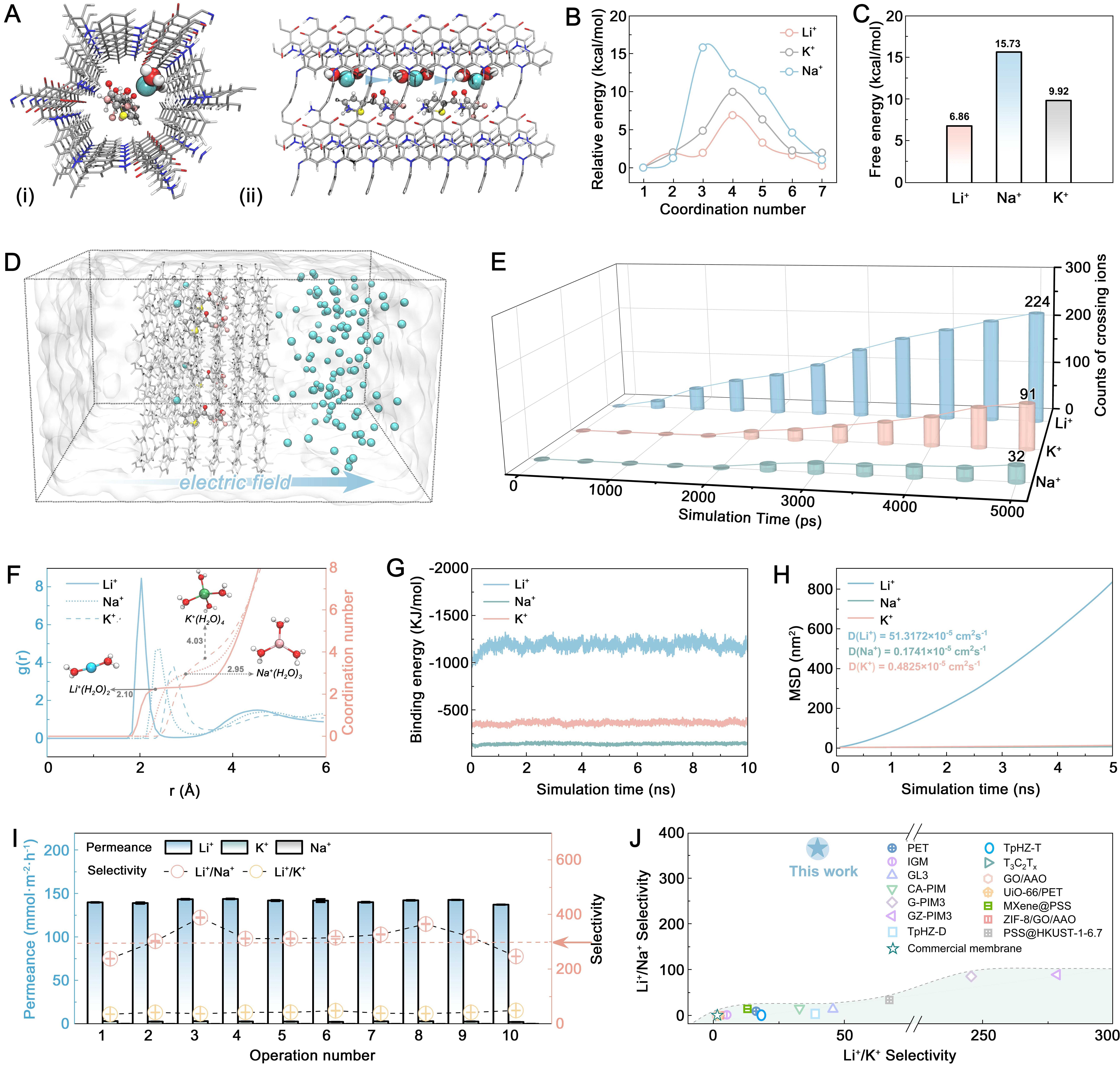 在全球能源結(jié)構(gòu)加速向清潔能源轉(zhuǎn)型中,鋰資源需求持續(xù)增長(zhǎng)。鹽湖型鋰資源因儲(chǔ)量豐富、開發(fā)潛力巨大,已成為我國(guó)鋰資源保障體系的重要組成部分。但傳統(tǒng)先提鉀后提鋰工藝流程長(zhǎng),各階段鋰夾帶損失大,因此鹽湖資源開發(fā)急切需要提高鋰收率。近年來,直接提鋰(Direct Lithium Extraction, DLE)技術(shù)因其高效、綠色環(huán)保的優(yōu)勢(shì),成為未來鹽湖鋰資源高效開發(fā)的重要發(fā)展方向。然而在實(shí)際鹽湖和后端沉鋰工藝中,Li+往往與極高濃度Na+共存,且Li+、Na+離子性質(zhì)相似,使得Li+/Na+分離成為直接提鋰過程中貫穿前處理與分離純化各環(huán)節(jié)的核心難題,也是當(dāng)前國(guó)際公認(rèn)的關(guān)鍵瓶頸。在離子分離工藝中,離子膜分離具有連續(xù)運(yùn)行和易于工程放大的優(yōu)勢(shì),已成為有效離子分離技術(shù)。然而,受限于傳統(tǒng)膜材料的篩分設(shè)計(jì),很難實(shí)現(xiàn)Li+/Na+分離,也無法解決Li+高通量傳輸?shù)耐瑫r(shí)對(duì)Na+的高選擇性抑制難題。