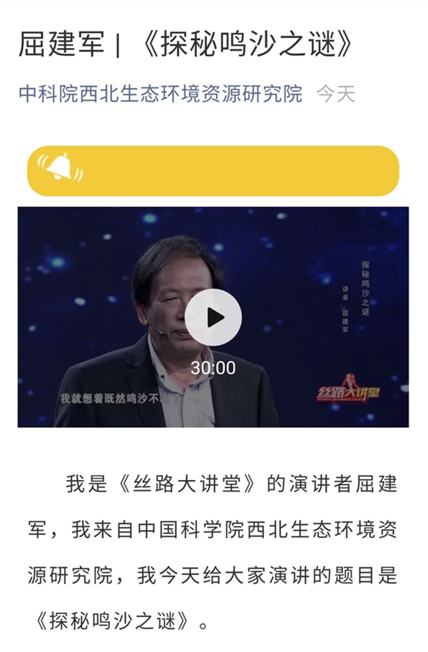 在西北研究院微信公眾號(hào)推送了屈建軍研究員主講的《探秘鳴沙之謎》科普?qǐng)?bào)告,報(bào)告講述了其研究團(tuán)隊(duì)通過長年的科學(xué)研究,發(fā)現(xiàn)自然沙粒表面的多孔(坑)狀結(jié)構(gòu)所構(gòu)成的共鳴腔,是鳴沙發(fā)聲的關(guān)鍵所在。就像掏耳朵一樣,把堵在孔洞里的臟東西洗干凈,鳴沙就“復(fù)聲”了,實(shí)現(xiàn)了鳴沙的修復(fù),成功復(fù)活了鳴沙自然現(xiàn)象,讓失聲的沙子再“唱歌”。