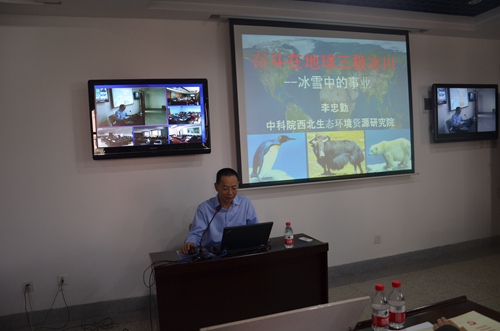 李忠勤結(jié)合自己在高寒極端環(huán)境無(wú)私奉獻(xiàn)30年的難忘工作經(jīng)歷,為與會(huì)人員深情講述了他《奮斗在地球三極冰川》的感人故事。他的報(bào)告分“北極科學(xué)考察介紹”、“走進(jìn)南極”和“中國(guó)冰川定位觀測(cè)”三個(gè)部分,通過(guò)普及地球三極(南極、北極和青藏高原)知識(shí)、梳理回顧世界及中國(guó)冰川科考?xì)v史、介紹中國(guó)冰川科考站情況及科考隊(duì)感人事跡,為大家作了一場(chǎng)生動(dòng)、感人的報(bào)告,一幅幅珍貴難得的實(shí)地照片再現(xiàn)了冰川科考工作的極端艱辛,一句句深情感人的樸實(shí)語(yǔ)言展示了共產(chǎn)黨人無(wú)私奉獻(xiàn)的政治品格。同時(shí),他強(qiáng)調(diào)指出,他所在的科研團(tuán)隊(duì)結(jié)合冰凍圈科學(xué)研究以野外工作為基礎(chǔ),具有人員分散、工作辛苦等特點(diǎn)的實(shí)際,制定了以黨小組為單元,研究室支部、所黨委聯(lián)動(dòng)的“兩學(xué)一做”方案,以科研工作為載體和抓手,深入扎實(shí)推進(jìn)“兩學(xué)一做”學(xué)習(xí)教育,取得了良好效果,發(fā)揮了黨支部是戰(zhàn)斗堡壘作用。他的報(bào)告圖文并茂,真實(shí)感人,既是一場(chǎng)科普?qǐng)?bào)告,更是一場(chǎng)生動(dòng)黨課,受到與會(huì)人員歡迎和好評(píng)。